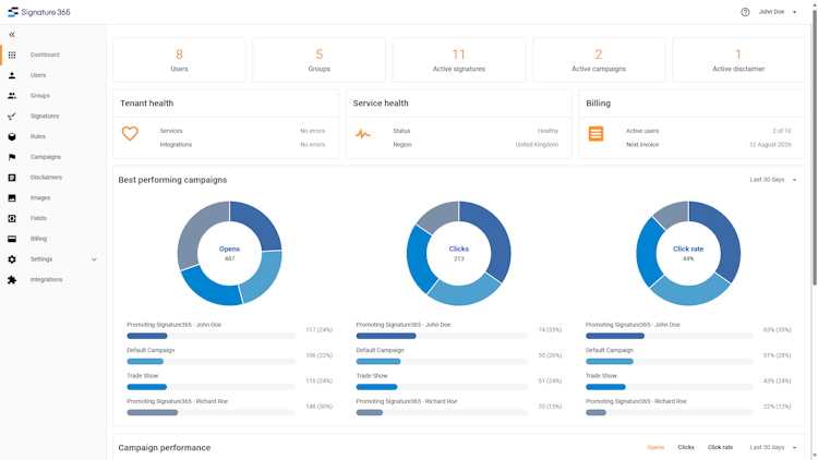 The platform includes management features accessible through an intuitive interface. Organizations can use pre-designed templates or create custom signatures that incorporate branding elements, employee photos, contact details, and social media links. It includes functionality for campaign banners with real-time tracking of impressions and conversions. Signature 365 integrates with MS Outlook across devices, offering a taskpane for selecting signatures and adjusting settings. It supports flexible signature assignment for individual users or groups and automatically adds legal disclaimers to meet compliance requirements for regulations such as GDPR, CCPA, and HIPAA.