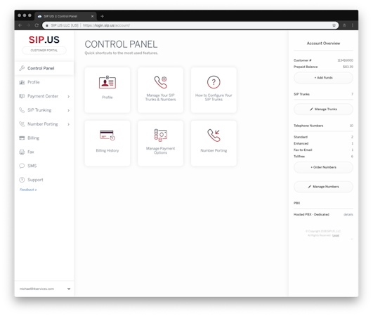 • The control panel enables SIP service quoting, provision, and billing, and users can promote their business with branded landing pages, electronic communications, and account interfaces.
