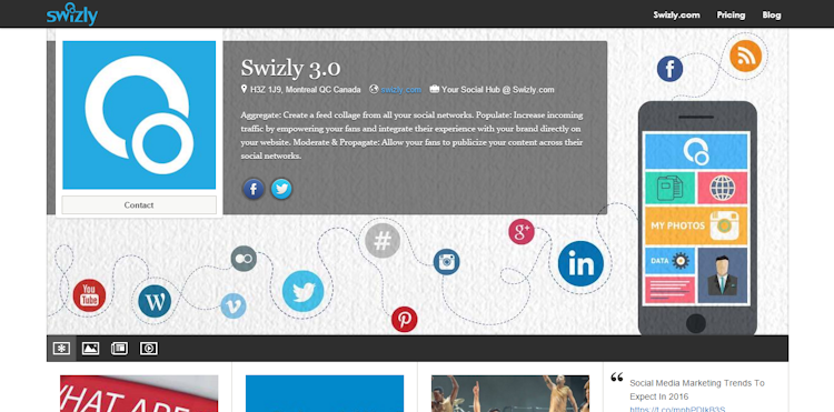Swizly is a social media aggregator that pulls content from 11 social networks, in addition to RSS feeds, and displays that content on one page - also known as the social hub.