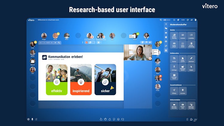 The software provides a structured moderation experience, allowing users to assign speaking rights, create discussion groups, and enable push-to-talk functionality for brainstorming sessions. The integrated moderation case combines the call-to-action principle with sophisticated interaction and feedback options, ensuring participants can be actively involved. vitero inspire also offers guided attention features, enabling users to direct focus and define virtual learning environments tailored to specific learning objectives.