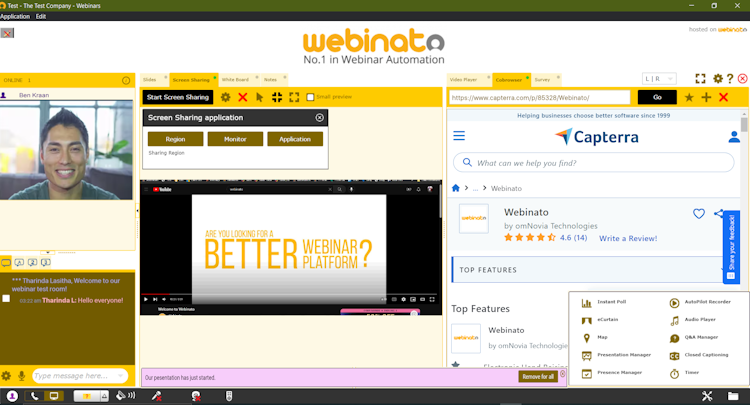 One of Webinato’s key features is the AutoPilot module which lets users record a live session and its interactivity, such as polling, Q&A, or file-sharing, and replay it for a new group of attendees. Other features include full in-room surveys, a world map, notes, an audio player, and more.