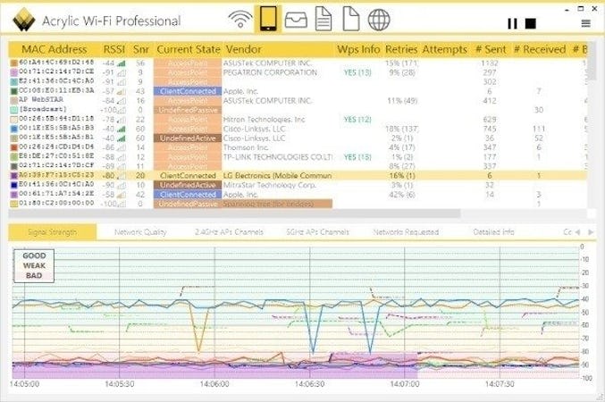 Acrylic WiFi Professional allows administrators to detect performance issues by selecting specific networks and improve deployment across multiple WiFi locations. Professionals can access information about hidden wireless networks, device traffic, WiFi speed, equipment inventory, and more.