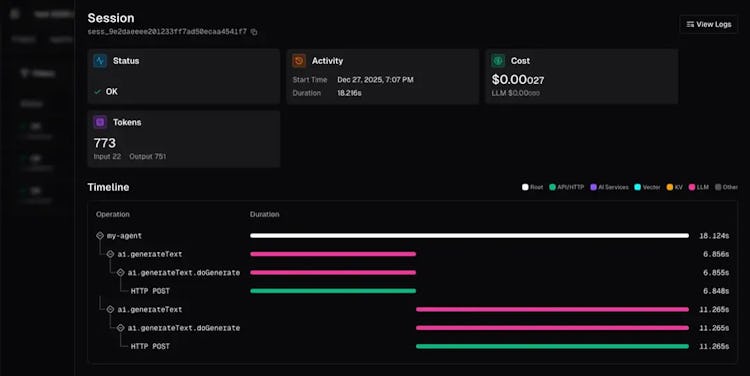• Automatic Observability — OpenTelemetry-based tracing is on from day one. Every LLM call, agent call, and API request is traced with timing, token counts, and costs. Structured logging, session tracking, and eval results all visible in one timeline with no instrumentation code required.