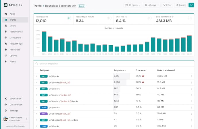 Apitally is an API monitoring and analytics tool built for small engineering teams. It provides real-time visibility into API traffic, errors, and performance through intuitive dashboards, and helps you troubleshoot issues faster with request logs and traces.