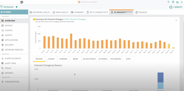 Aruba Central provides insights into current and historical views of the network, which allows enterprises to track connectivity status. Teams can receive alerts about network sites, devices, and clients' health according to requirements.