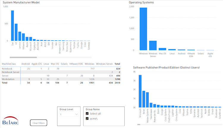 Belarc's cloud architecture allows users to simplify and automate the management of all of their desktops, servers and laptops throughout the world, using a single database and Intranet server. BelManage automatically creates an accurate and up-to-date central repository (CMDB), consisting of detailed software, hardware, and security configurations.