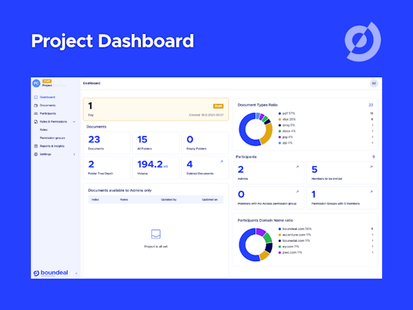 Boundeal is a virtual data room (VDR) that provides a secure online environment designed for the storage and sharing of confidential information. The platform functions as a digital vault, essential during critical business processes such as mergers, acquisitions, audits, and due diligence. Security is integrated at every development stage, with the system undergoing SOC2 audits and external penetration testing to ensure it meets stringent standards for data protection, confidentiality, and availability.