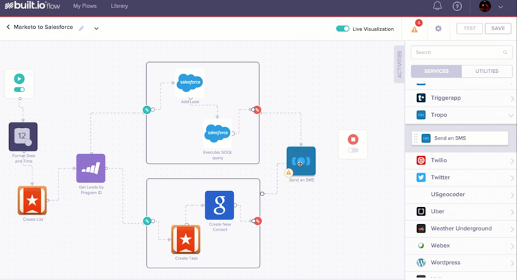 Built.io Flow is a cloud-based integration platform-as-a-service (IPaaS) designed to provide end-to-end integration and business process automation for IT admins, developers, and business users. The Express edition is designed with a point-and-click interface for business users to create automated workflows without requiring the input of the IT department, and the Enterprise edition is suited more for technical teams, with a drag-and-drop interface, API builder, and custom code editor.