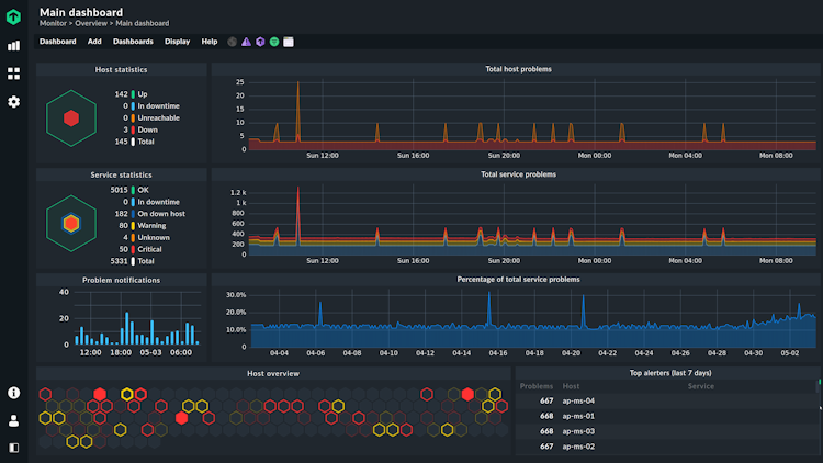 • Data visualization in modern customizable dashboards: Get an overview over a group or all monitored hosts via the main dashboard. Create new dashboards using Checkmk's graphical editor.