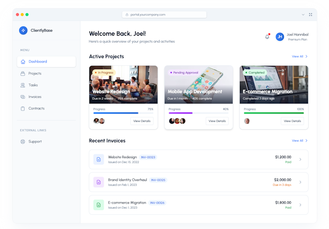 The solution is particularly valuable for agencies and consultants seeking to enhance client relationships through professional, transparent communication channels. The interface organizes information into logical sections including projects, tasks, invoices, and contracts, with visual indicators displaying project progress and status updates. ClientlyBase operates without storing client data in its system, instead fetching information in real-time when clients access their portals, maintaining both security and data integrity while delivering a polished, professional client experience.