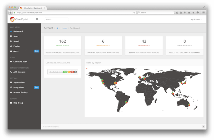 CloudSploit is an open source, automated security and configuration scanner for monitoring and maintaining a secure and compliant cloud infrastructure environment on Amazon Web Services (AWS). In order to help businesses with analyzing AWS security, CloudSploit provides features including on-demand scans, auditing tools, risk alerts, results archiving and search, region heatmaps, downloadable reports, email summaries, and more.