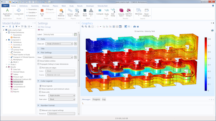 COMSOL Multiphysics includes visualization and postprocessing tools, which allow organizations to display simulation data using interactive graphs, charts, and figures and export results into text, DAT, CSV, and excel format. Research professionals can also design custom modeling applications and share them with process operators, test laboratories, manufacturing departments or clients.