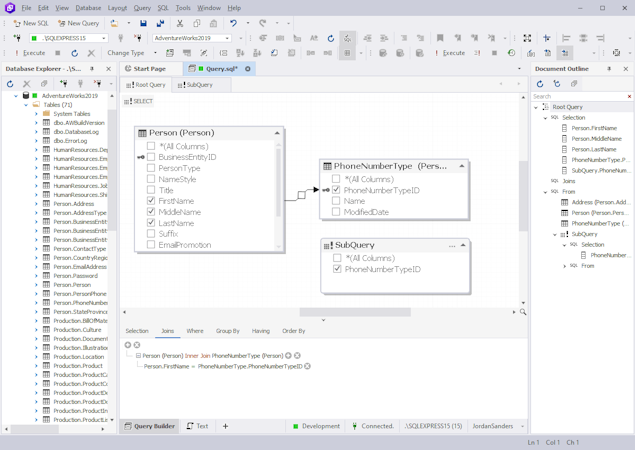 Complex Query Building. The tool is suitable for constructing both basic and advanced queries. It supports nested sub-queries, derived tab tables, JOINs, and common table expressions. The graphical representations of objects are significantly easier to work with during the sophisticated query building.