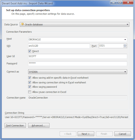 To connect Excel to Oracle you just need to specify the server TNS alias (for connection via Oracle Client) or host, port, and Oracle service ID (for direct connection) and your credentials. Add-in's direct connections don't require Oracle Client installed. In the Advanced parameters, you can configure secure SSH and SSL connections.