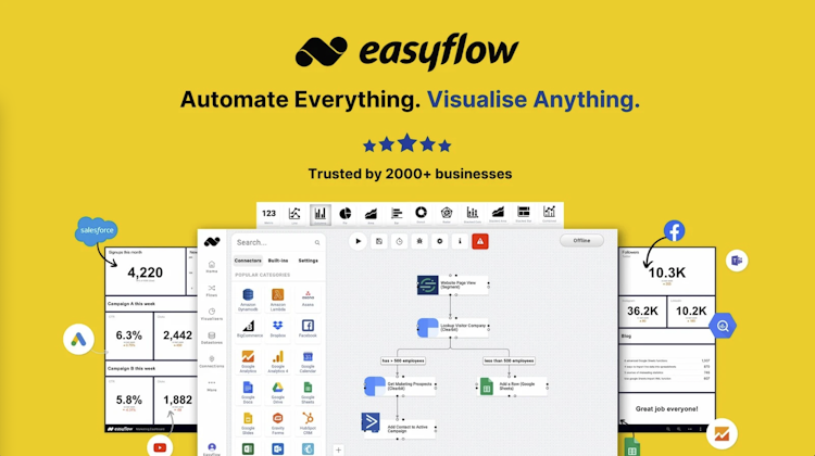 Easyflow enables users to connect apps, analyze data, create automated processes, and build KPI dashboards customized to their specific requirements. By consolidating data from different sources, teams can gain a comprehensive view of your performance and can monitor key metrics at a glance.