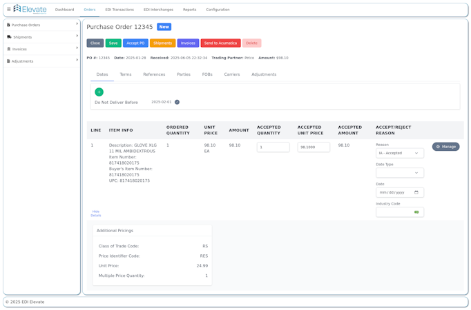 EDI Elevate integrates with enterprise resource planning, accounting and warehouse management systems. Available integrations include Acumatica, NetSuite and Acumen systems for automated synchronization of EDI transactions with back office applications. The platform supports standard EDI document types commonly required in supply chain operations such as purchase orders, advance ship notices, invoices and inventory updates. Integration configurations are defined during implementation with the provider’s team managing technical mapping between EDI transaction sets and corresponding business data structures. The service maintains application programming interface connectivity for real time or scheduled data exchange with integrated applications and relies on provider-led documentation for technical specifications and setup procedures.