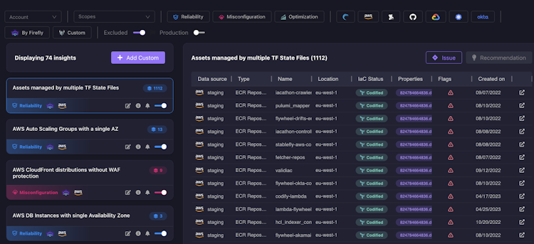 Firefly’s Cloud Asset Management solution enables SRE, Platform and DevOps teams to control their entire cloud footprint in one unified inventory. By continuously scanning your cloud assets and your infrastructure as code, Firefly understand which parts of it are codified vs unmanaged then automatically transforms your actual cloud assets into IaC such as Terraform, Pulumi, or Helm.