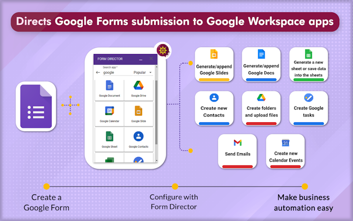 Form Director is an add-on that helps businesses bridge the gap between Google Forms and various applications, enabling data transfer and automation. It directs Google Form submissions to Google Workspace apps such as Google Docs, Slides, Sheets, Calendar, Contacts, Tasks, and more.