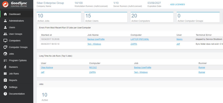 • Keep track of all GoodSync licenses from one centralized interface while remotely controlling and monitoring individual instances of GoodSync Server and Workstation Runners.