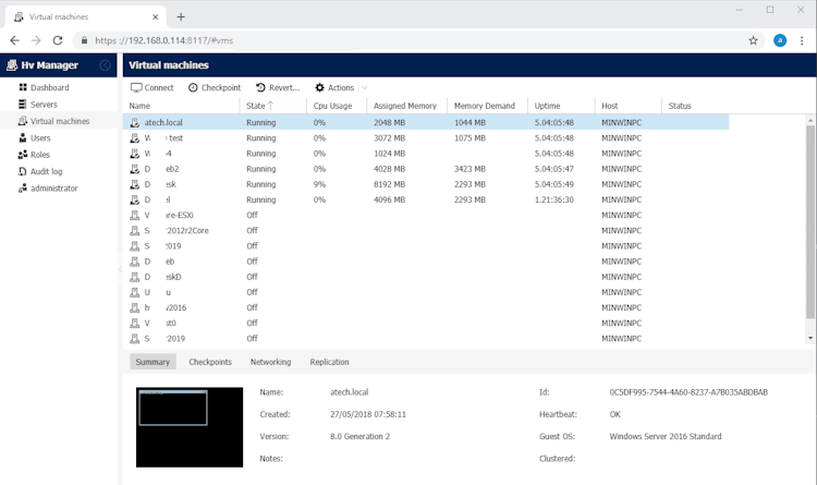 HV Manager is a VMs manager for Hyper-V, that allows you to access virtual machines through a web browser.