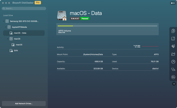 iBoysoft DiskGeeker is a disk management tool developed to help Mac users achieve cross-platform disk usage, enhance data security, optimize system performance, and improve work by providing users with various features, including read and write access to BitLocker-encrypted and NTFS drives, disk encryption through BitLocker or FileVault, network drive mapping, disk error repair, drive cleanup, APFS volume backups, disk speed testing, disk clone, and more within a unified interface on Mac.