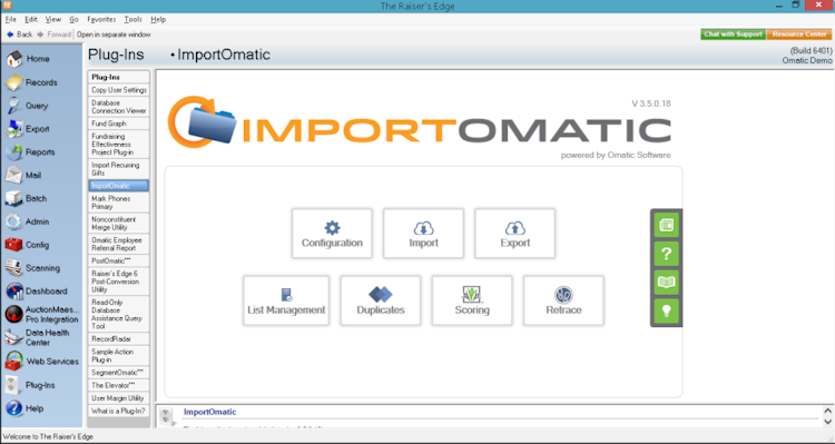 ImportOmatic enables quick data integration for Blackbaud's Raiser's Edge and Raiser's Edge NXT. The solution redefines efficiencies with baked-in intelligence to clean data, smart profiles for tailored processing, and an expanding catalog of connectors (including MailChimp, WealthEngine, Luminate Online and more) that make import and export a one-step process.