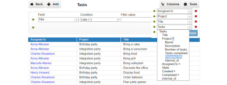 InstaDB offers many functionalities and features which are available out of the box, in any table created. Every column added to a table within InstaDB is automatically accessible in the table filters allowing for advanced filtering functionality. Users can compose several filters to sort records in a hierarchical order, and show, hide, and change the order of columns. A pivots generator can be used in every table and view.
