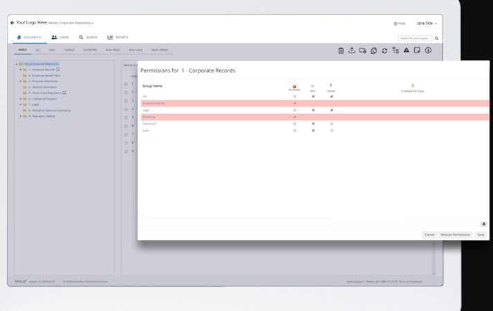 Venue enables enterprises to store generated reports in a centralized database and utilize the search functionality to retrieve specific files from the repository. Administrators can sort uploaded files using folders, assign documents to individuals, and monitor the review status of files. It also helps businesses add executives in user groups with information including email ID, name, company, and contact details.
