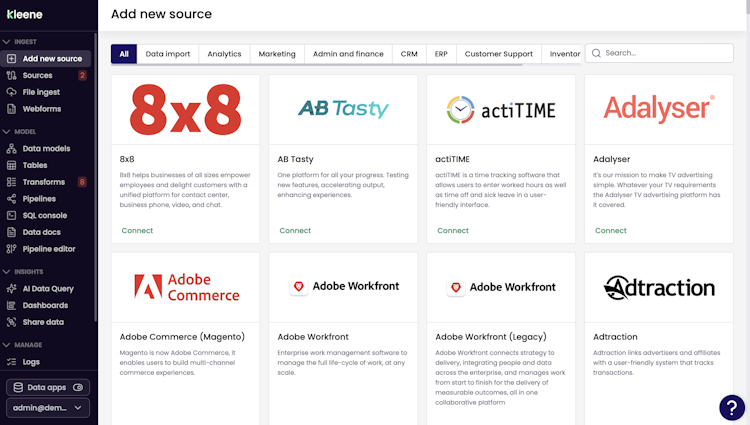 Kleene.ai is a data management platform that helps businesses unify, transform, and visualize business data for actionable insights. The platform enables teams to automate extraction from multiple sources and consolidate information into a single, reliable view without manual exports or spreadsheets. The system serves organizations across marketing, finance, and supply chain functions that face data fragmentation, manual reporting, and resource constraints that hinder data utilization and AI adoption.