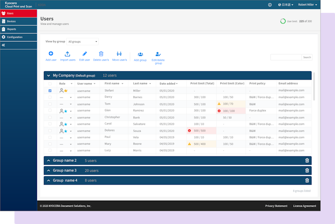 KYOCERA Cloud Print and Scan offers solutions to a variety of jobs. Print and scan cloud-based documents. Send email links to customers for sign-up and set-up. Manage multi-tenancy. Set up many different customer organizations. Maintain separate spaces for customers. Keep each customer’s data private and secure.