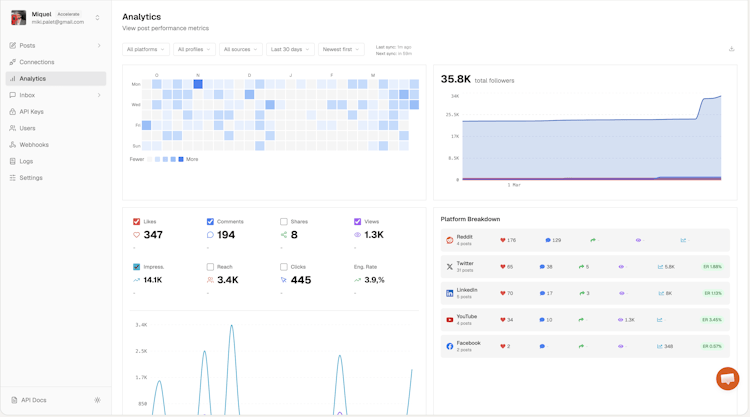 Zernio is a unified social media API platform that enables developers and AI agents to publish, schedule, and manage content across 14+ social networks through a single integration. Instead of building separate integrations with each platform, developers make one API call and Zernio handles authentication, media formatting, rate limits, and platform-specific requirements. The platform supports post scheduling, content management, comments and DMs automation, analytics tracking, ads management, and media uploads. It integrates with Instagram Business and Creator APIs, TikTok Business API, LinkedIn, YouTube, Twitter/X, Facebook, Pinterest, Reddit, Threads, Bluesky, and WhatsApp Business API. Features include automatic token refresh, webhook notifications, and rate limit management. Built for SaaS companies, agencies, and AI agent builders, the product is fully white-label.