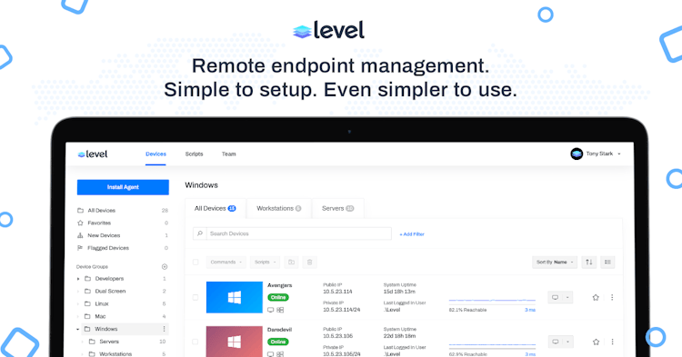 Level empowers IT professionals with the flexibility and security to manage, monitor, and control their company's devices from anywhere in the world, directly from their web browser. This solution was designed to work with Windows, Mac, and Linux.