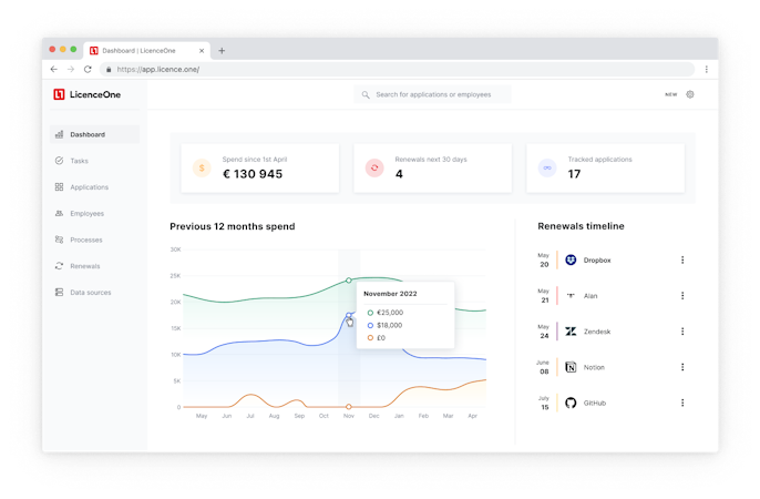 LicenceOne is a SaaS management solution that helps small and mid-size businesses handle software subscriptions, control user access, collect digital invoices, detect renewal dates, and more. The platform offers various features such as activity tracking, audit logs, third-party integrations, and employee offboarding.