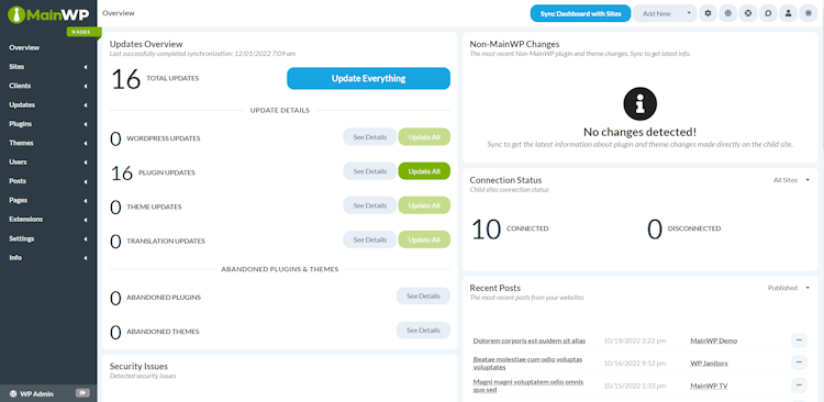 Once you've connected your sites (called Child Sites) to your Dashboard, you can do almost anything from your MainWP Dashboard that you could do from your Child Sites wp-admin.