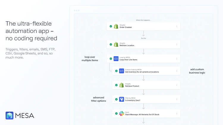 MESA is the AI automation platform that helps businesses work smarter, not harder. It connects your favorite apps and automates repetitive tasks to save time while improving accuracy and consistency across every workflow. From syncing data and managing inventory to creating personalized customer experiences, MESA helps teams focus on strategy instead of manual work. Its AI-powered tools adapt to your operations, making it easy to launch and scale automations as your business grows. Whether you’re just starting out or running an established brand, MESA helps you get more done with less effort.