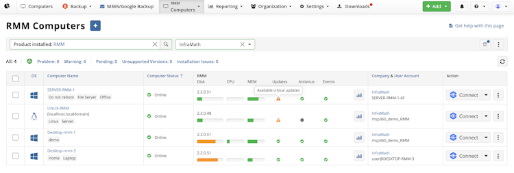 MSP360 RMM is an all-in-one remote monitoring and management solution designed for MSPs and IT teams. With unlimited endpoints, centralized management, free built-in remote access, proactive monitoring, automated issue resolution, MSP360 RMM empowers IT professionals to streamline operations, reduce downtime, and manage endpoints effortlessly – all without long-term commitments.