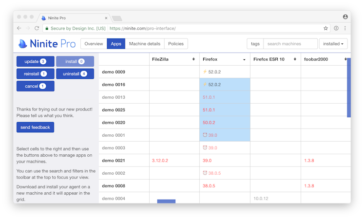 With Ninite Pro, IT administrators can gain a high-level view of all machines, patching status, and patching updates in one dashboard. Users can either select an individual cell or multiple cells to update, install, or uninstall an app on any machine. For out-of-office updates, Ninite Pro allows users to set auto-update policies to apply updates to apps as soon as the updates are available. Ninite Pro automatically applies tags to machines in order to organize machines based on offline/online status. Advanced users can utilize Ninite Pro Classic's command line to apply additional tools and scripts.