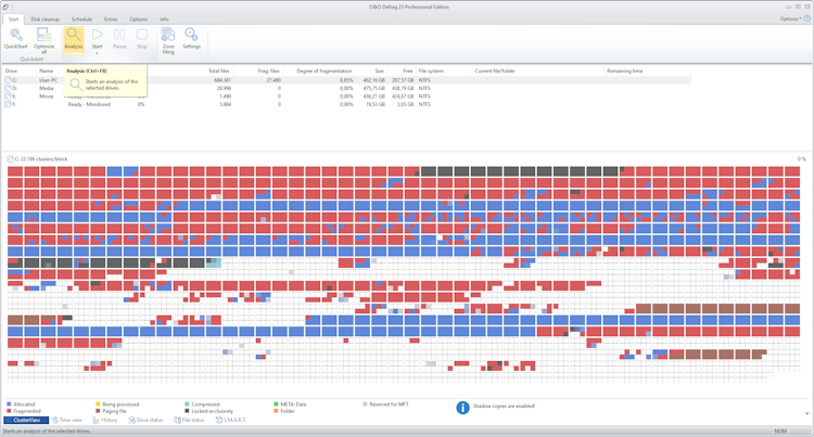 By solving this problem at source, O&O Defrag boosts performance levels substantially, depending on the level of spliced data on the machine. It automatically reduces timeouts, slow starts and system crashes while at the same time increasing speed of data backups. Longer hardware duration & less investment in hardware going forward.