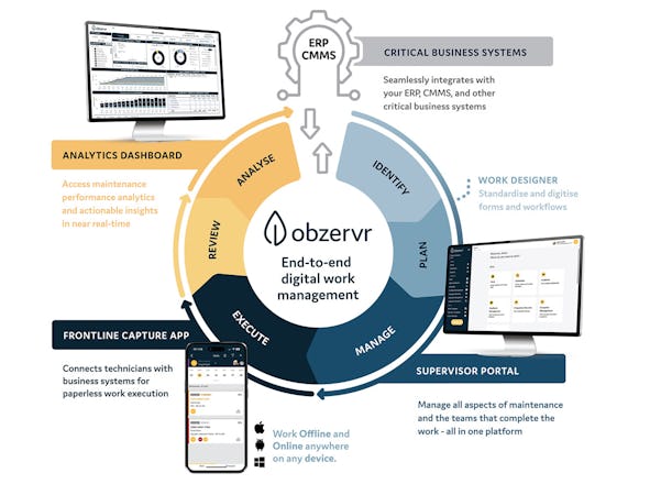 A fieldwork automation and mobility solution for heavy industry, Obzervr's Digital Work Management Solution helps asset intensive organisations move asset maintenance processes from paperwork-based admin to full digital work execution.