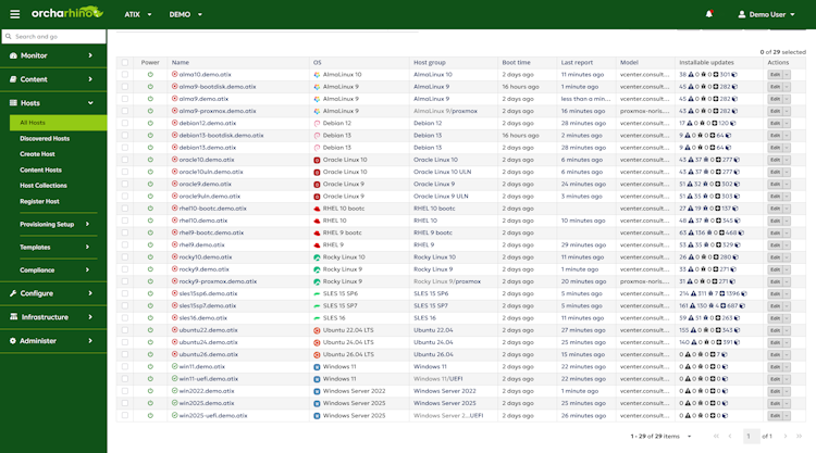 orcharhino is an IT infrastructure automation and orchestration software platform that centralizes the management of complex enterprise computing environments. The solution addresses operational requirements across physical, virtual and cloud-based systems. It targets organizations in sectors such as finance, government, telecommunications and manufacturing. orcharhino provides lifecycle management functions to automate system deployment, configuration, patching and regulatory compliance while preserving control over heterogeneous operating systems and infrastructure platforms.