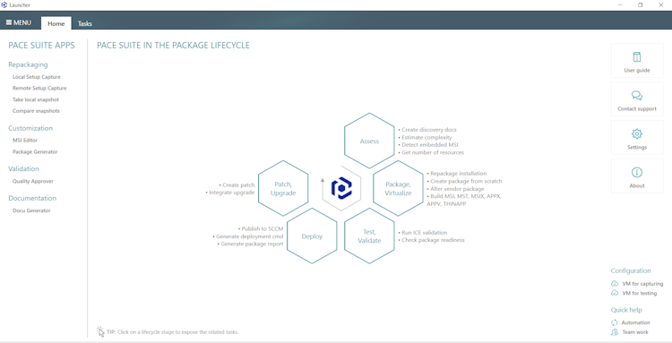 PACE Suite is an intelligent application packaging solution aimed at simplifying and optimizing the end-to-end application packaging process and reducing the delivery time of high-quality software to end-users across thousands devices. The solution provides a wide range of advanced features that allow covering all aspects of application packaging, from creating, editing, (re) packaging to testing and deploying packages. In addition, PACE Suite supports packages of multiple formats, such as MSI, MSIX, AppX, App-V, ThinApp, and IntuneWin. PACE Suite provides users with rich functionality to capture installations remotely on multiple virtual machines (ESXi, Hyper-V, and VirtualBox) automate checks for package quality, security, and readiness, as well as create Windows Installer packages, publish MSI packages to SCCM, and much more. Users can seamlessly integrate PACE Suite in the existing software environment with the help of the REST API.