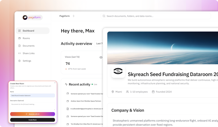 Pageform is a narrative driven virtual data room designed to transform scattered materials into structured deal experiences for founders, fund managers, and deal teams. It addresses limitations of file sharing by combining document management with storytelling capabilities. The software serves professionals involved in fundraising, due diligence, investor relations, and deal execution across venture capital, private equity, and startup ecosystems. It delivers presentation and tracking capabilities beyond conventional data room solutions.