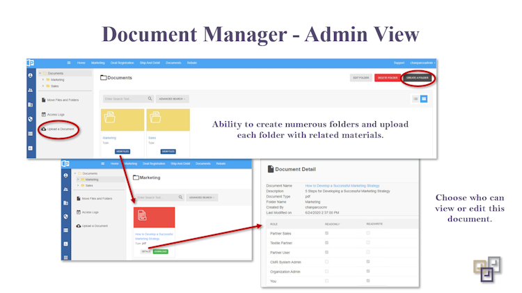 PartnerPortal integrates with several third-party applications including Salesforce, Microsoft Azure, CRM in Cloud and more to import leads and POS information. The software enables managers to upload files, categorize them into folders, and access documents related to sales, product overview, training guides, case studies, white papers, and more.