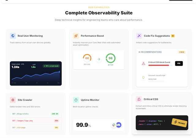 The platform operates through a five-layer crawl engine that completes site audits in approximately thirty seconds and integrates six monitoring tools. Real user monitoring captures page load times from actual visitors on production devices instead of simulated environments, collecting metrics such as Largest Contentful Paint with historical trend analysis. The Performance Boost module executes Lighthouse audits on individual pages, tracks Core Web Vitals over time, and generates performance scores for both desktop and mobile experiences. The AI powered Code Fix Suggestions feature analyzes audit data to propose specific improvements for render-blocking CSS and unused JavaScript with ready-to-apply recommendations. The Site Crawler examines every page to detect broken links, missing meta tags, HTTP status errors, and indexability issues before search engines encounter them. The Uptime Monitor provides continuous availability tracking with immediate alerting when downtime is detected. The Critical CSS extraction tool automatically identifies and inlines above-the-fold CSS to improve performance without manual effort.