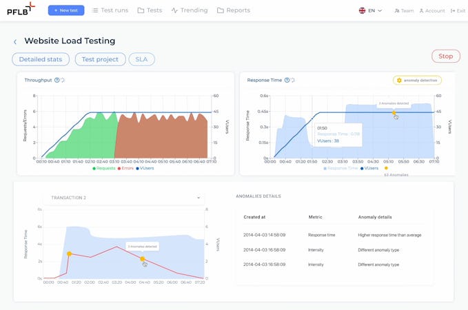 PFLB enables users to import JMeter JMX files and execute them from the cloud. It also offers AI-enabled performance insights. The tool automatically identifies performance bottlenecks with analytics. It assists with reporting and enables businesses to discover load testing results in real-time Grafana dashboards and compare different test runs in the trend report.