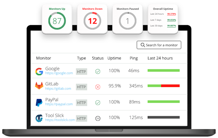 Receive instant downtime alerts via email, SMS, Slack, Twitter, and Webhook.
