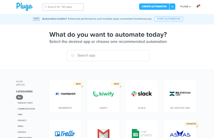 Pluga is an automation solution responsible for integrating different payment, marketing, ERP, and other tools used in the day-to-day processes of the company. Facebook Lead Ads, RD Station and Google Sheets can all be accessed without the need to develop code. In order to connect two or more systems into a single automation, it is only necessary to select them and authenticate them so that Pluga can receive and send data between them. The platform's functions also include filters to define which payments or collections should be transmitted from one tool to the other, the option to integrate different accounts that the company runs via the same tool, and folders that help organize the established automation.