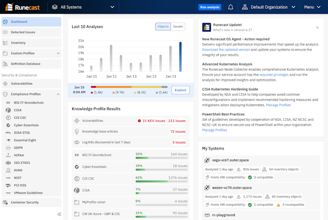 In addition, it provides continuous audits against vendor best practices and common security standards and frameworks such as BSI IT-Grundschutz, CIS, Cyber Essentials, DISA STIG, DORA, Essential 8, GDPR, HIPAA, ISO 27001, KVKK, In a matter of minutes it scans your configurations and provides you with fit-gap analysis and remediation scripts. Our automated processes remove all the manual work and you can easily filter and sort issues and compare historical configurations at your convenience. Furthermore, Runecast proactively assists with Cloud Security Posture Management (CSPM), Kubernetes Security Posture Management (KSPM), and Governance, Risk Management and Compliance (GRC).