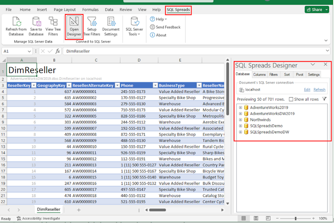 SQL Spreads is a cloud-based Excel Add-In that gives end users the ability to update data in SQL Server using Excel as an interface.