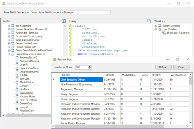 Devart SSIS Data Flow Components for Azure SQL Data Warehouse allows you to integrate Azure SQL Data Warehouse with other databases and cloud applications via SQL Server Integration Services (SSIS). They include optimized AzureDWH Source, AzureDWH Destination, and AzureDWH Lookup components and provide their own AzureDWH Connection Manager. Devart Azure Synapse Analytics Source component offers a convenient editor, which displays all the connection tables and their columns and allows users to build a query to Azure Synapse Analytics via drag-and-drop.